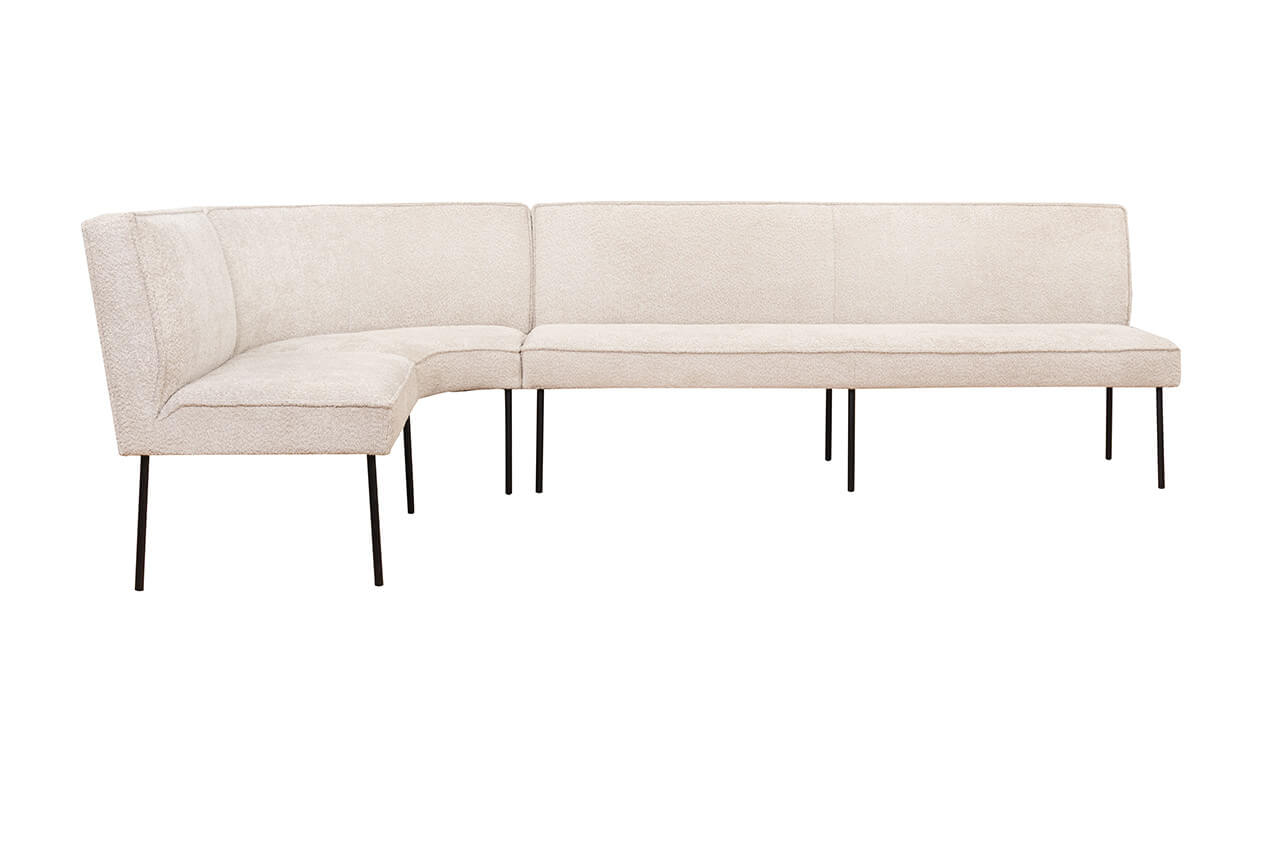 Amalfi Eetkamerbank brengt comfort, stijl en flexibiliteit samen in één ontwerp. De bank is bekleed met een zachte bouclé stof, wat zorgt voor een warme en luxe uitstraling. De strakke lijnen, subtiele biesafwerking en slanke zwarte metalen poten geven de bank een moderne, verfijnde look die moeiteloos past in verschillende interieurstijlen. Keuze uit diverse opstellingen, kleuren en soorten bekledingen. Aanbieding in microvezelstof Atletico.