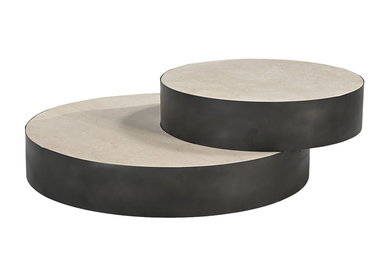Stijlvolle ronde salontafel met marmeren bottocino bovenblad en metalen onderstel. Uniek en robuust ontwerp van hoogwardige kwaliteit.